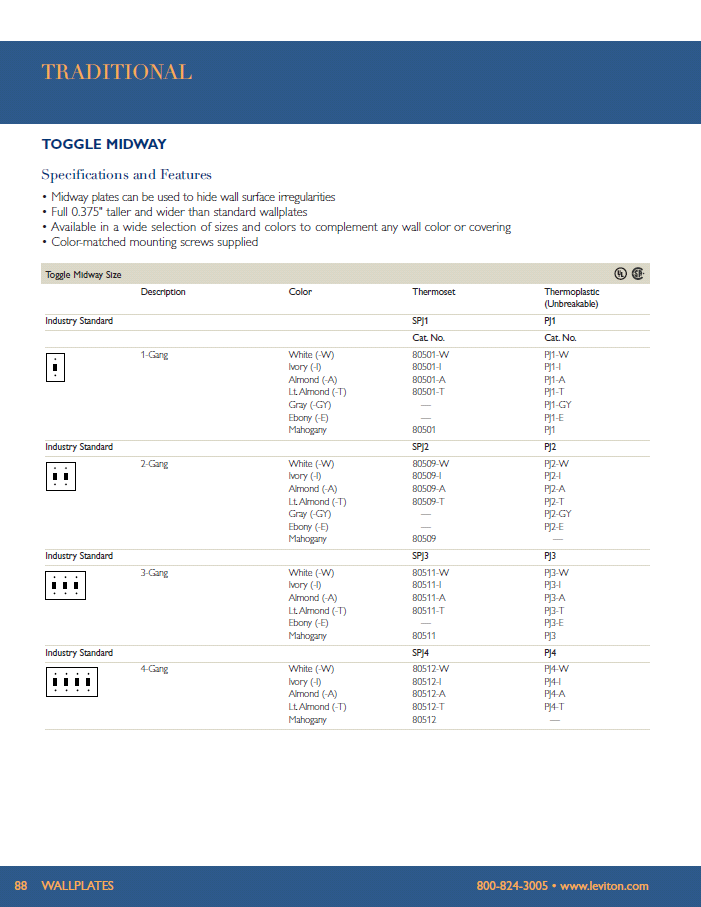 • Familiar and functional, Leviton Traditional Wallplates are designed for use with Traditional Leviton devices. They represent styles and form factors that have stood the test of time. Their clean lines work in virtually any location, whether in new or retrofit construction, and they install quickly and easily. Leviton offers Traditional Wallplates in a vast array of colors and configurations.